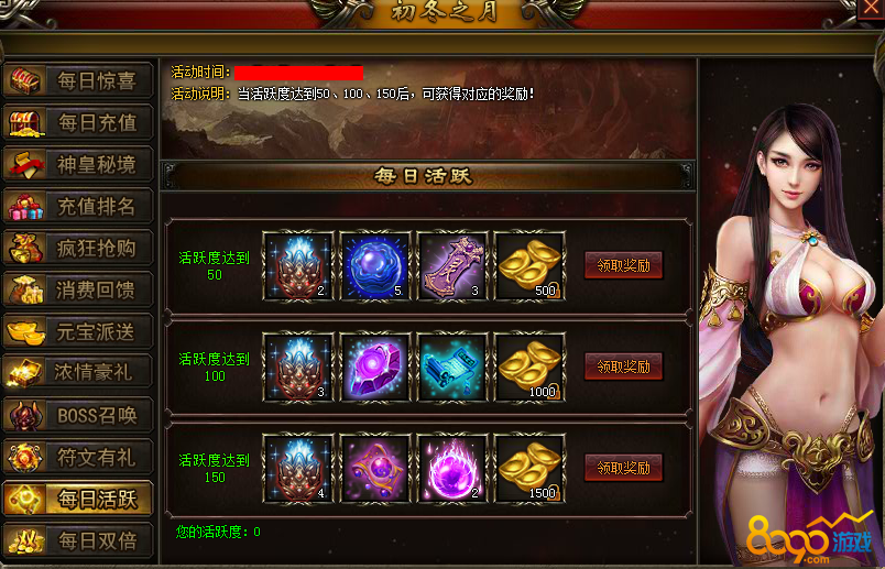 【活动说明】:当活跃度达到50、100、150后,可获得相对应的奖励!