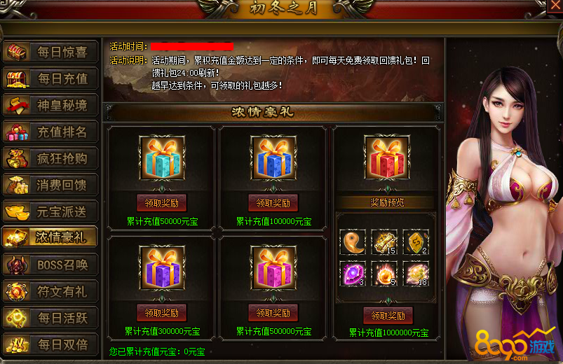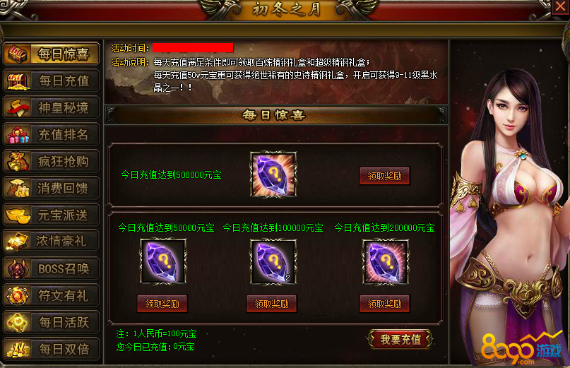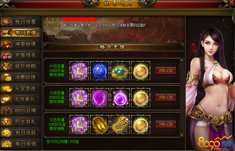 【活动说明】:每日充值金额达到一定条件时,可领取一份奖励。