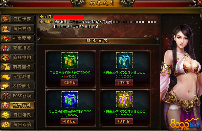 【活动说明】:活动期间,每天击杀怪物获得的符文值达到50000、100000、200000、300000时,即可获得大量的符文值奖励!