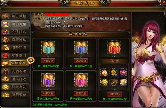 【活动说明】:活动期间,累计充值金额达到一定的条件,即可每天免费领取回馈礼包!回馈礼包24:00刷新!越早达到条件,可领取的礼包越多!
