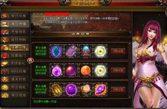 【活动说明】:活动期间,累积消费金额达到一定条件,即可领取一份丰厚的奖励!投保和发红包消耗的元宝不会进行计数。