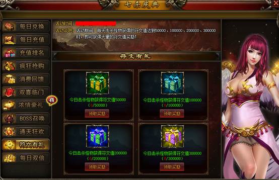 【活动说明】:活动期间,每天击杀怪物获得的符文值达到50000、100000、200000、300000时,即可获得大量的符文值奖励!