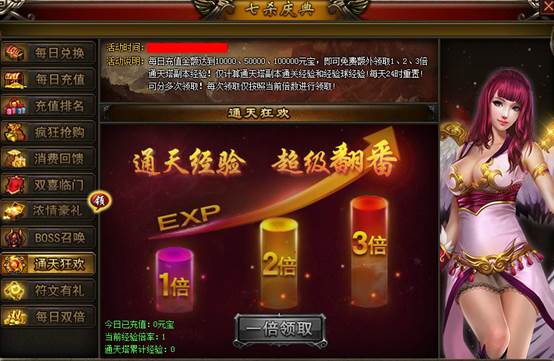【活动说明】:每日充值金额达到10000、50000、100000元宝,即可免费额外领取1、2、3倍通天塔副本经验!仅计算通天塔副本通关经验和经验球经验!每天24时重置!可分多次领取!每天领取仅按照当前倍数进行领取!