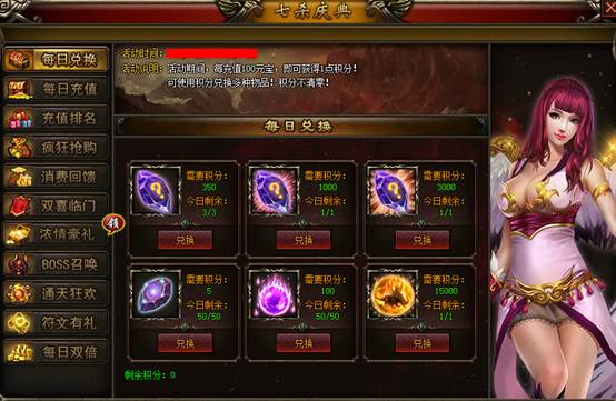 【活动说明】:活动期间,每充值100元宝,即可获得1点积分!可使用积分兑换多种物品!积分不清零!