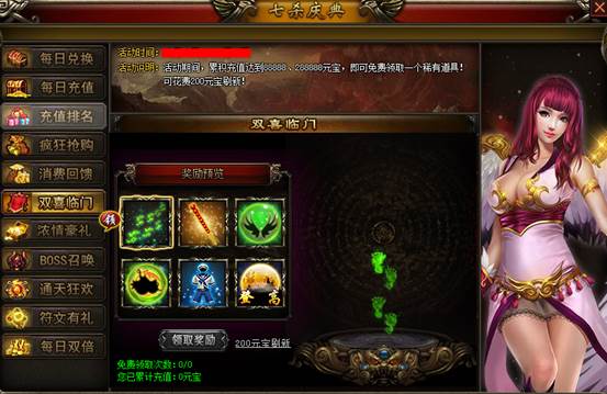 【活动说明】:每日充值达到88888、288888元宝,即可免费领取一个稀有道具!可花200元宝刷新!