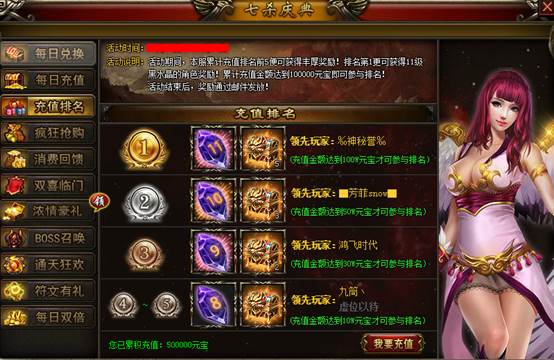 【活动说明】:活动期间,本服累计充值排名前5名便可获得丰厚奖励!排名第1更可获得11级黑水晶的奖励!累积充值100000元宝即可参与排名!活动结束后,奖励通过邮件发放!