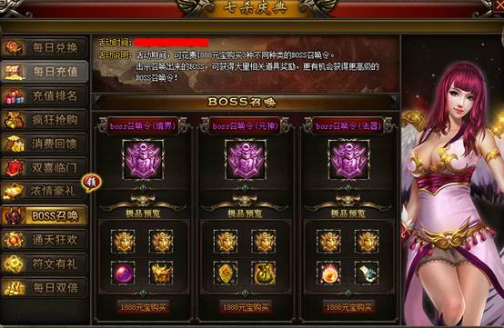 【活动说明】:活动期间,可花费1888元宝购买3种不同的BOSS召唤令!击杀召唤出来的BOSS,可获得大量相关道具奖励,更有机会获得高级BOSS召唤令!