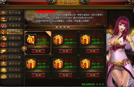 【活动说明】:活动期间,每3小时刷新出超值礼包!使用元宝购买,购买可享受2-4折折扣,并有机会获得七杀币加成!最多可获得2倍七杀币。抢购时间结束或全部售完,会有新一批超值礼包刷新!