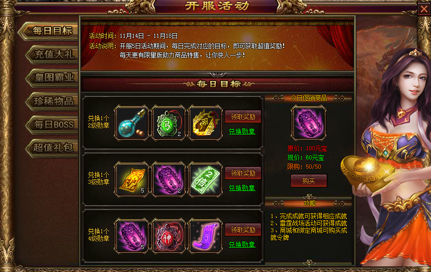 活动内容:开服5日活动期间,每日完成对应的目标,即可获取超值奖励!
