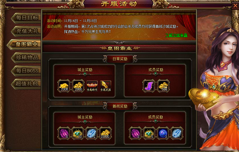 活动内容:开服期间,第一次占领沙城成功的行会的会长及成员均可获得首战沙城奖励。