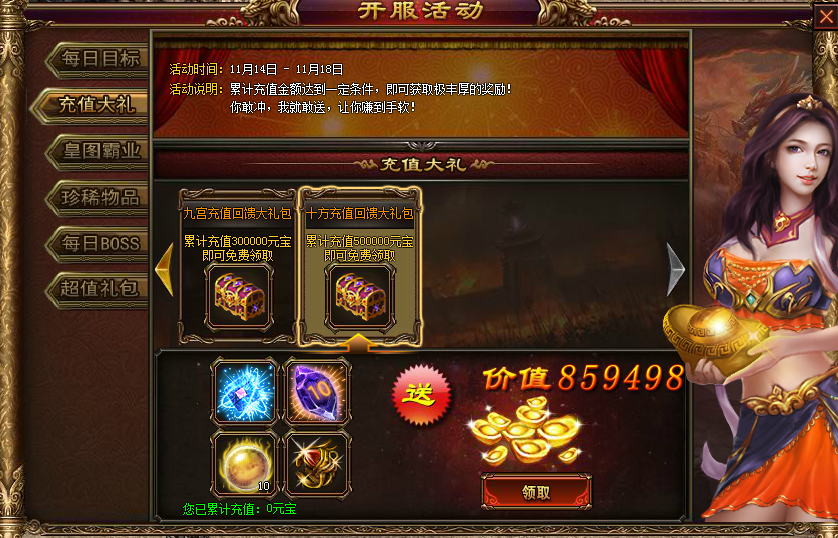 活动内容:每日充值1000、3000、6000、10000,皆可免费获取豪华礼包!