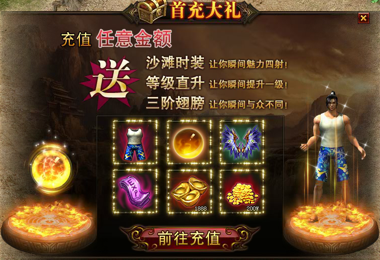 奖励内容:等级直升丹(70级之前可升一级)、沙滩时装*1、屠兽羽翼(3档)、超级经验符、1888绑定元宝、200万绑定金币。