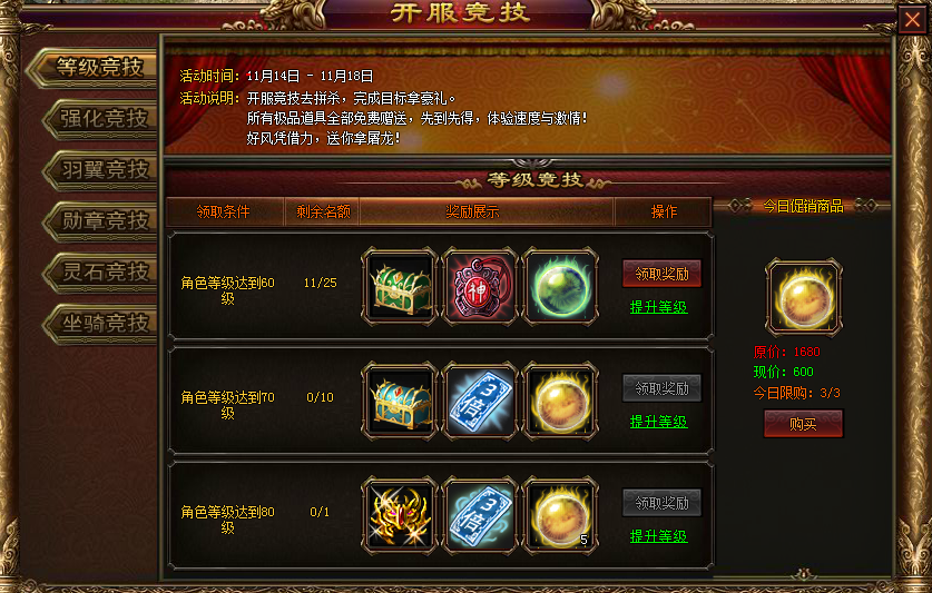 活动时间:开服前5天 活动内容:开服竞技去拼杀,完成目标拿奖励!开服前5天,达到等级、强化、羽翼、勋章、灵石、坐骑各项领取条件,更有至尊神装等你拿,名额有限,先到先得哟!另外还有每日促销等你拿!