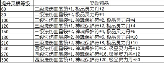 2.灵根提升回馈礼:活动期间内,仙友提升灵根达到对应等级,即可获得丰厚的物品奖励!