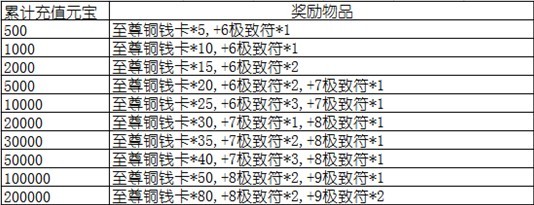 活动内容:活动期间内,仙友累计充值达到要求即可获得对应礼包,惊喜奖励等您拿,赶紧行动吧!
