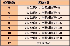 活动内容:活动期间,等级大于等于40级的仙友提升坐骑等阶达到对应的等阶数即可获取奖励,培育良驹我最行!