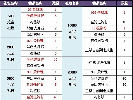 庆典大礼包:宝宝中级成长丹x2、宝宝中级资质丹x2、灵魂水晶x6、倾城之恋x1、9朵玫瑰x1、祝福泉水x8