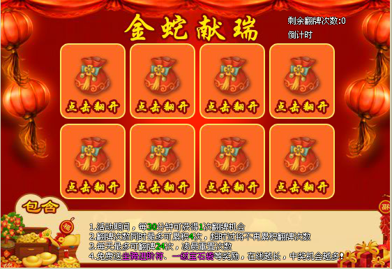 活动时间:2013年2月13日0:10到2013年2月17日23:59(具体开启时间游戏内活动图标出现为准)
