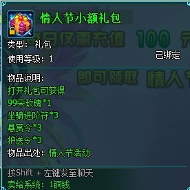 活动内容:活动期间,等级大于等于40级的仙友每天首冲超过100元宝任意元宝,即可获得情人节小额礼包呦!抓住情人节的尾巴,送给心爱的他(她)!