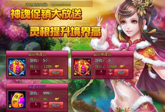 活动内容:活动期间,等级大于等于40级的仙友可在活动界面购买高级神魂包、超级神魂包、神魂保护符,数量有限哦,快来抢购吧!