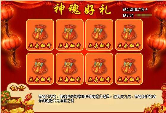 活动内容:活动期间,等级大于等于40级的仙友每天都可参加抽奖活动,每30分钟可以获得一次抽奖机会,最多累计4次(每天最多只能抽奖24次,未抽奖次数不累计),可获得大量神魂提升符、铜钱卡以及灵力丹哦!