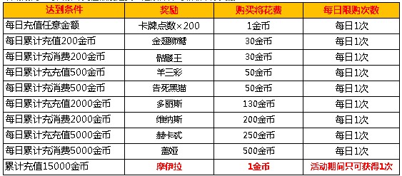 任务五,每日累计充值200金币:卡牌点数*100