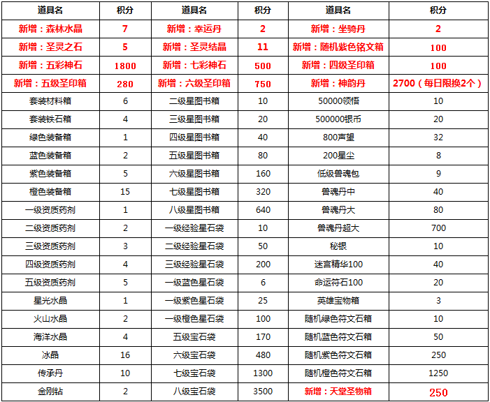5.除部分道具有兑换次数限制外,积分商城每种道具每位玩家每天限量兑换9999次。