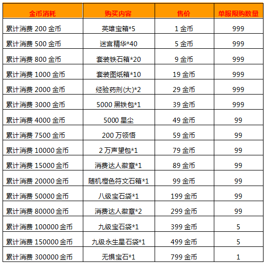 单笔5000~9999金币可获得:经验药剂(大)*1,2000星尘,珍稀材料*150,6级宝石袋*1