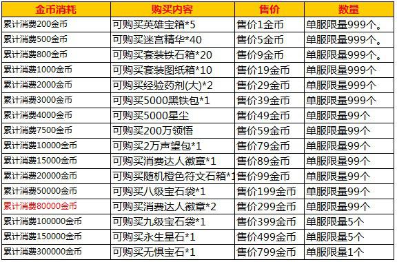 单笔5000~9999金币可获得:经验药剂(大)*1,2000星尘,4级橙色全能星石袋*1,遗世宝珠*100