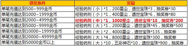 1.每单笔充值一定额度金币只可获得对应档奖励一次,无法兼得其他奖励。