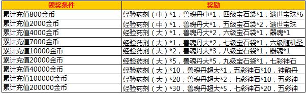 活动期间内,充值消费满足下列条件即可领取对应返还金币