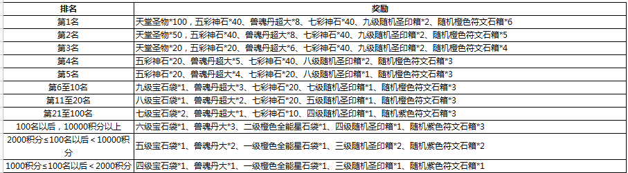 美酒节期间,排行在1~10名之间的玩家,可领取:五彩神石*4,七彩神石*8,天堂圣物箱*20
