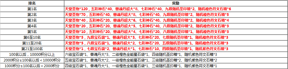 美酒节期间,排行在1~10名之间的玩家,可领取:五彩神石*4,七彩神石*8,天堂圣物箱*20