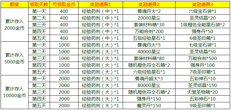 注:累计存入=累计充值,上述为三选一,累计充值2000,5000,10000金币即可获得上述奖励