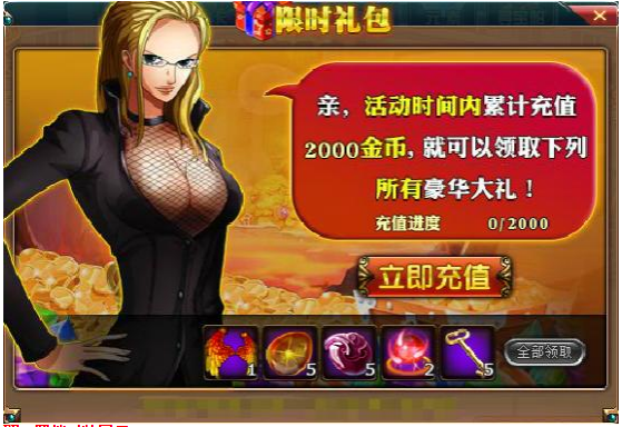活动规则:活动期间,玩家充值2000金币,即可在活动页面领取额外奖励;