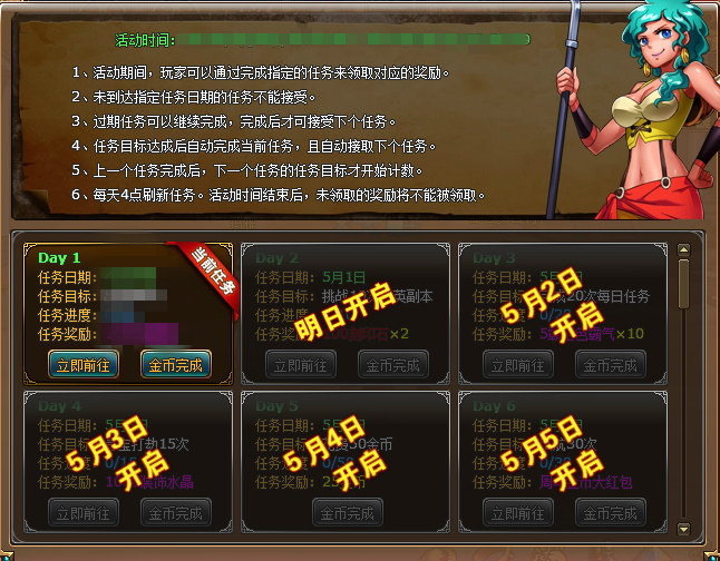 2、活动期间,未到达指定任务日期的任务不能接受,过期任务可以继续完成,完成后才可接受下个任务;