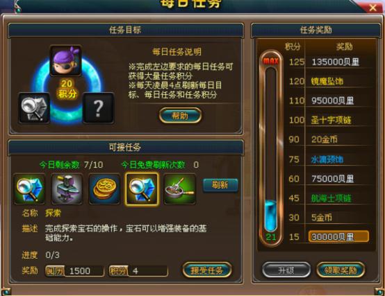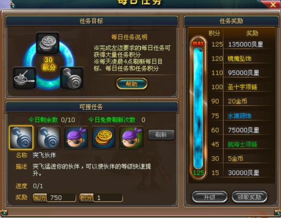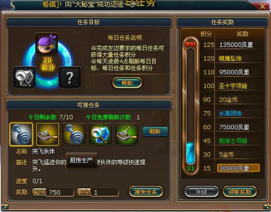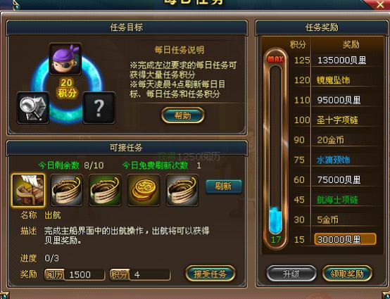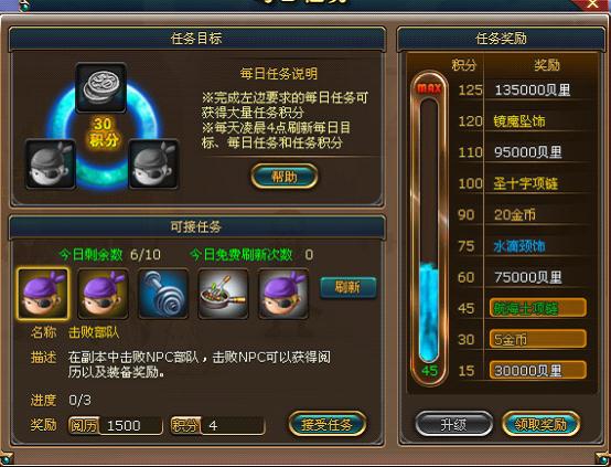 热血海贼王很多新手玩家会发现,自己做每日任务都选择积分4或者3的任务来做,但10个任务做完,都和高级奖励遥遥无期。下面我来演示一遍。