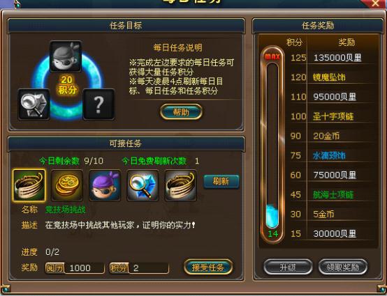 积分想要达到125分,除了目标任务奖励的90分外,10个小任务给的积分加起来要达到35分,如果RP不是很好就不要太浪费金币去刷新了。