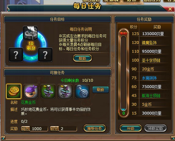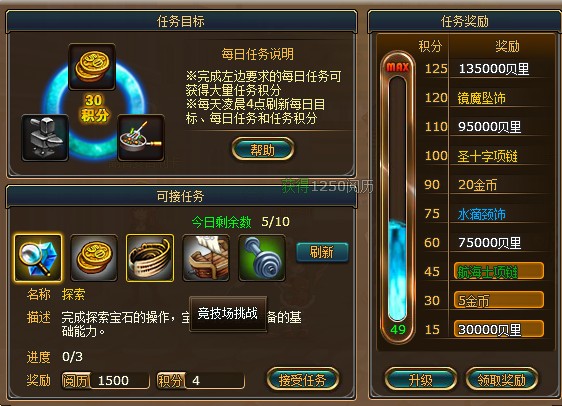 任务界面里,左下角就是可接的任务,右上角的是额外的积分奖励,只要按要求完成所需的任务的话,就可以获得额外的积分奖励,任务的种类可以通过消耗金币“刷新”来更换,完成后可以获得对应的奖励以及一定的积分。