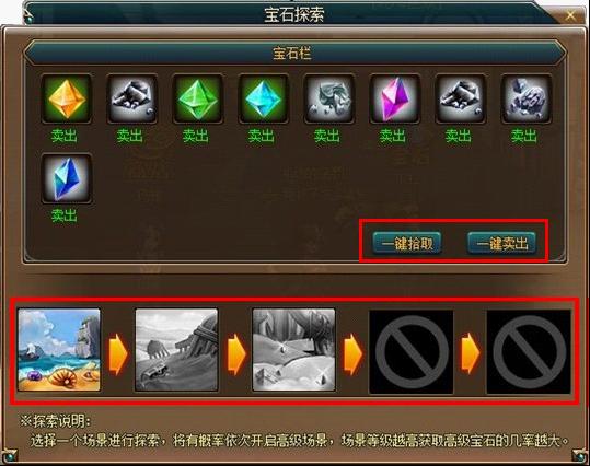 (2)点击任意场景进行探索可随机获得宝石,探索场景级别越高获得高品质宝石的机率越大,每次进行探索有一定机率开启更高级别的探索场景;