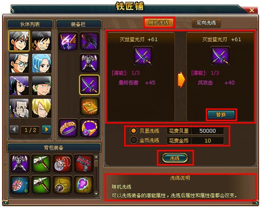 (1)随机洗练:重新获得装备附加属性的种类和附加属性的数值。选择了花费类型之后点击”洗炼”,箭头右边可以看到洗炼后得到的属性,玩家可以选择“替换”或者继续“洗练”。