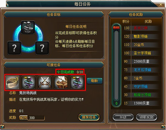 进入每日任务界面后,在可以领取的5个任务中选择适合自己的接受任务,完成之后可以获得一定阅历;