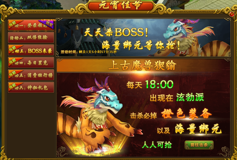活动内容:活动期间18点在“泫勃派”1线固定刷新1只BOSS,击杀BOSS后可获得当前世界等级的橙色装备以及海量绑元。