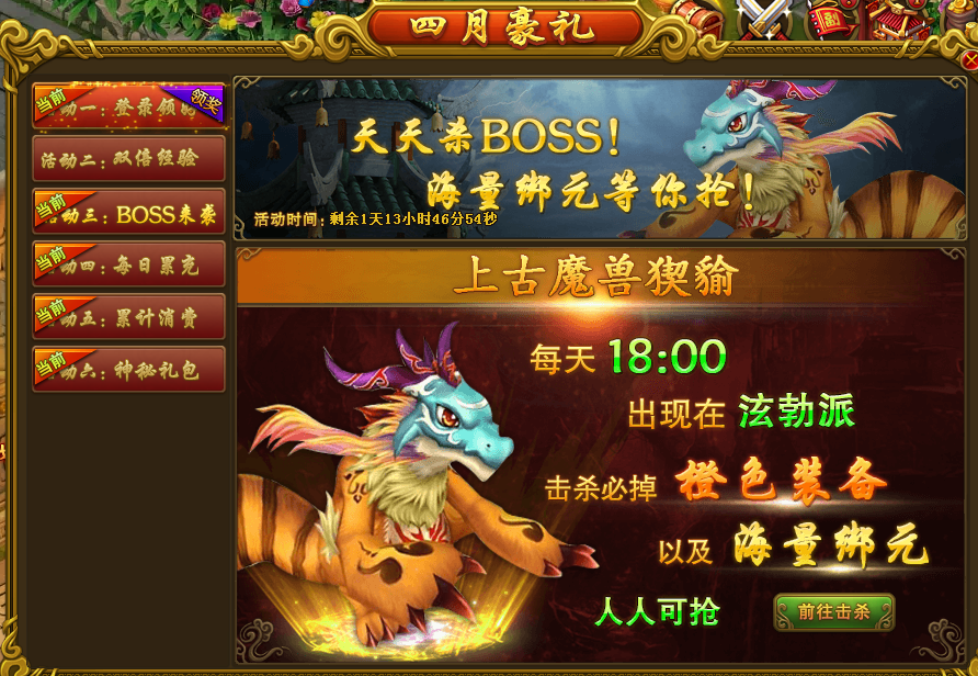 活动规则:活动期间,上古魔兽猰貐每天晚间18:00会出现在1线泫勃派,击杀BOSS即可掉落橙色装备和海量绑元,人人可抢。