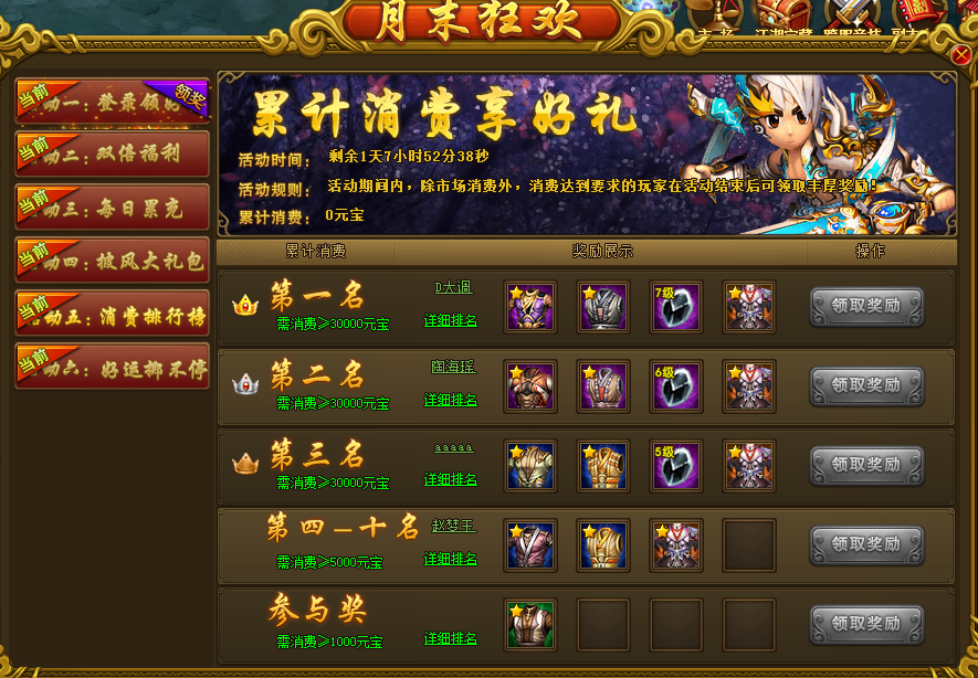1. 消费排行榜第一名,累计消费≥30000元宝可获得:六阶内甲碎片*1,六阶战甲碎片*1,7级武功黑曜石*1,月魔王子10天限时卡*1