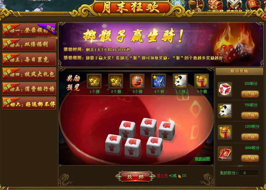 活动内容:玩家花费元宝进行投掷,六个筛子分别会随机一面朝上,投掷结果会显示给玩家确认: