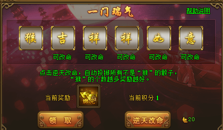 玩家确认后可选择领取当前积分奖励,或者再次花费元宝进行逆天改命,逆天改命不会影响到已经是“猴”字的筛子。通过投掷筛子不仅可以获得奖励,还可以累计筛子积分,筛子积分可兑换更多珍稀道具,积分的数量越多,玩家能兑换更珍贵的道具。