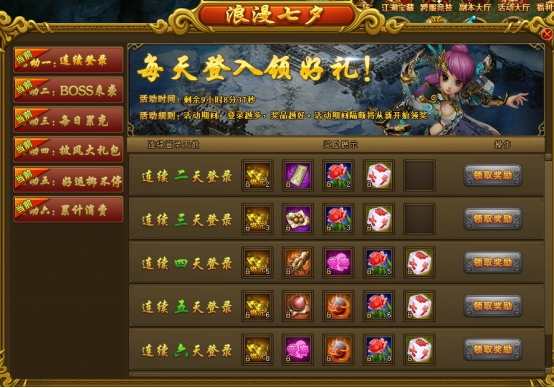 2. 连续登录2天即可领取:20绑元、副本卷轴*1、单恋玫瑰*2、骰子券*1;