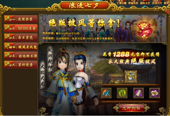活动规则:活动期间,花费一定数量元宝即可购买披风大礼包;