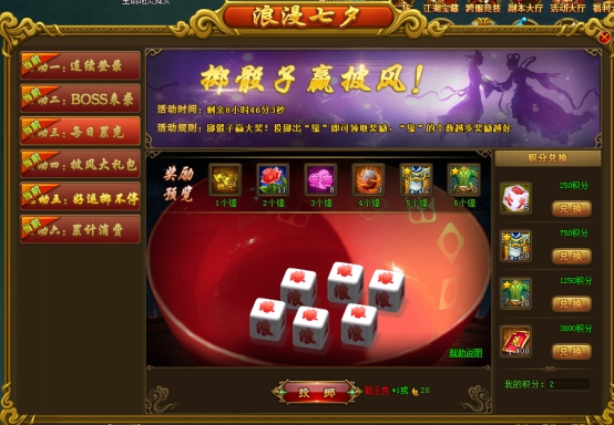 玩家花费元宝进行投掷,六个骰子分别会随机一面朝上,投掷结果会显示给玩家确认,玩家确认后可选择领取当前积分奖励,或者再次花费元宝进行逆天改命,逆天改命不会影响到已经是“缘”字的骰子。通过投掷骰子不仅可以获得奖励,还可以累计骰子积分,骰子积分可兑换更多珍稀道具,积分的数量越多,玩家能兑换更珍贵的道具。(亲密度卷轴绑定)